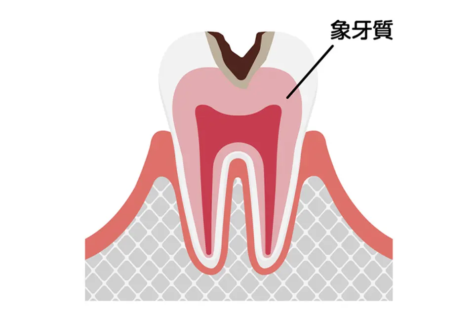 むし歯が進行し、象牙質に達した状態。